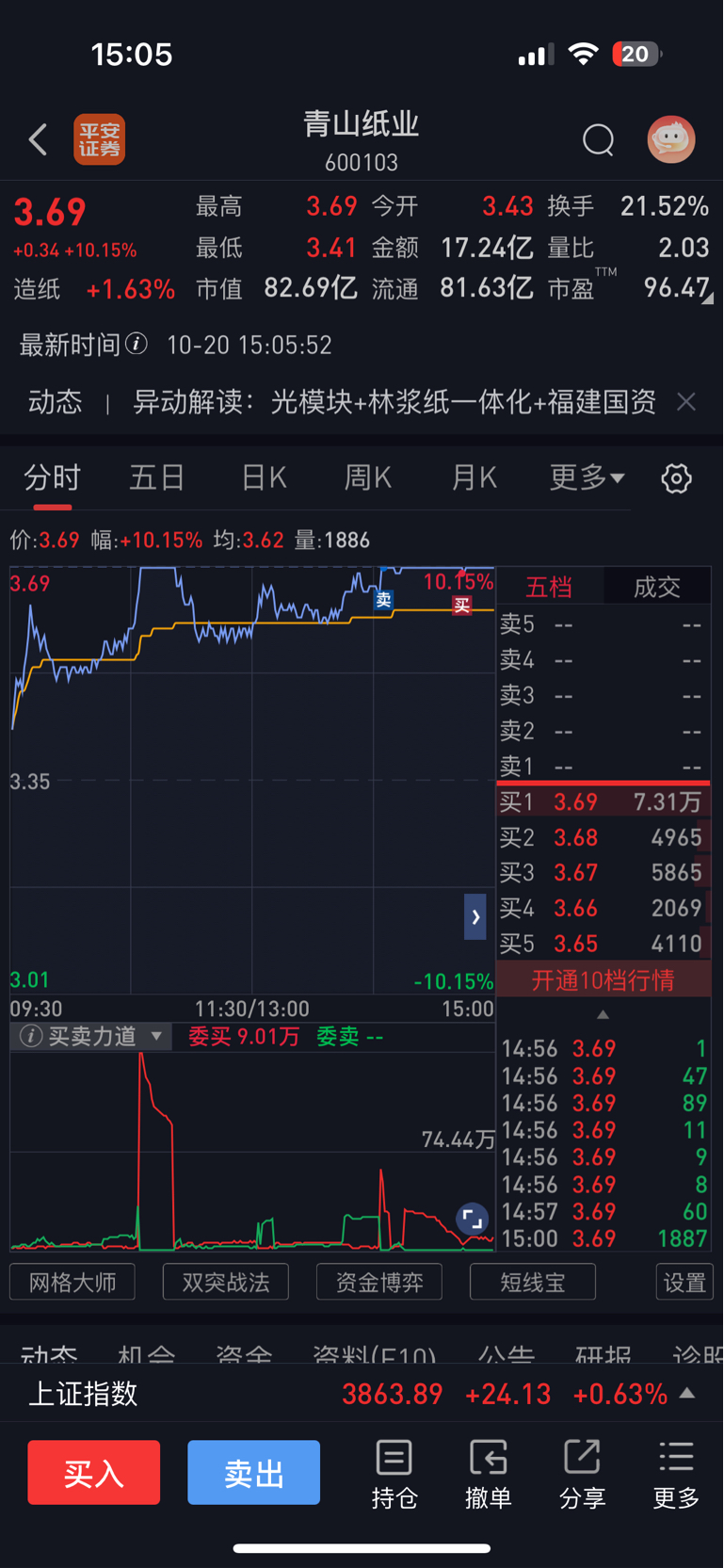 $青山纸业(SH600103)$ 好险,早上开板来不及卖下午盯盘了开板瞬间卖出去,差点接不回了,一分钱的代价有点大。