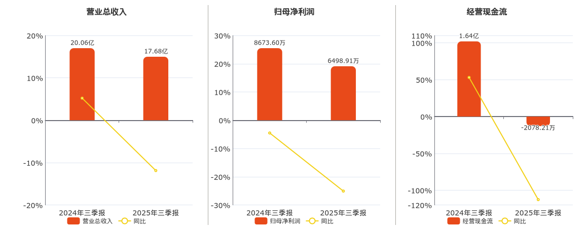 公司营业总收入为17.68亿元,较去年同报告期营业总收入减少2.38亿元,同比较去年同期下降11.87%。归母净利润为6498.91万元,较去年同报告期归母净利润减少2174.70万元,同比较去年同期下降25.07%。经营活动现金净流入为-2078.21万元,较去年同报告期经营活动现金净流入减少1.85亿元,同比较去年同期下降112.67%。