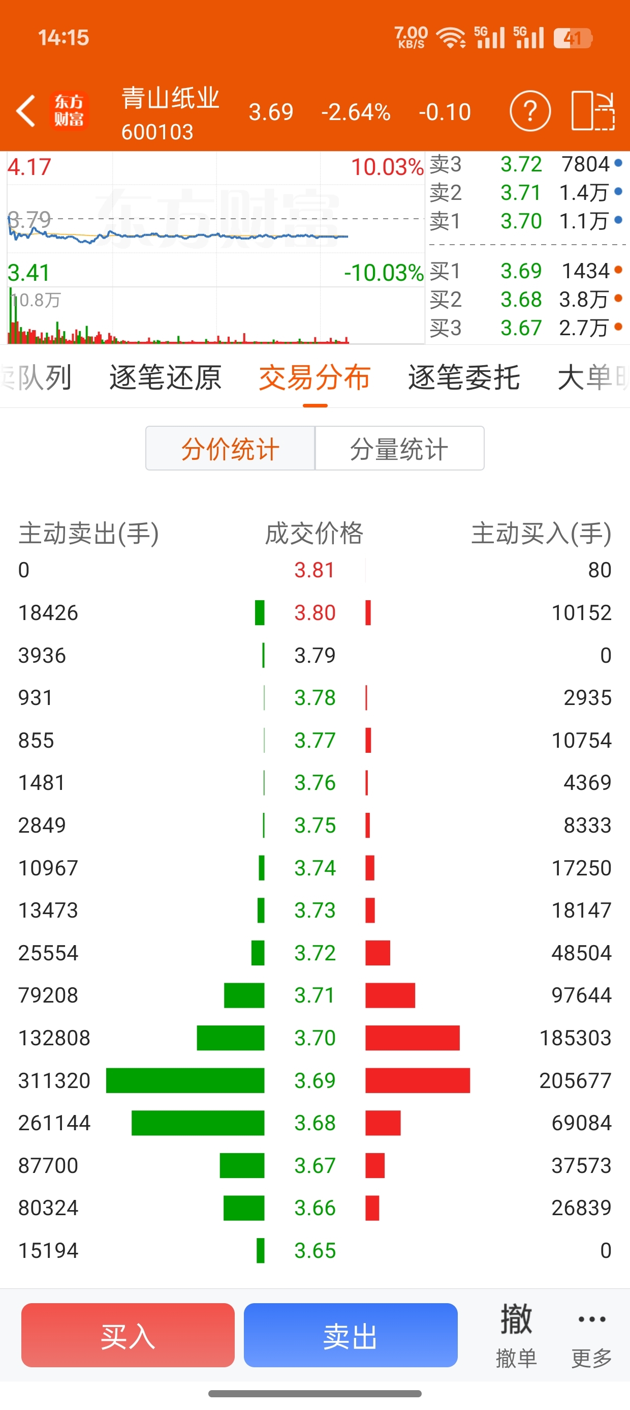 $青山纸业(SH600103)$ 今天在369大量出,明天在360出,明天验证!