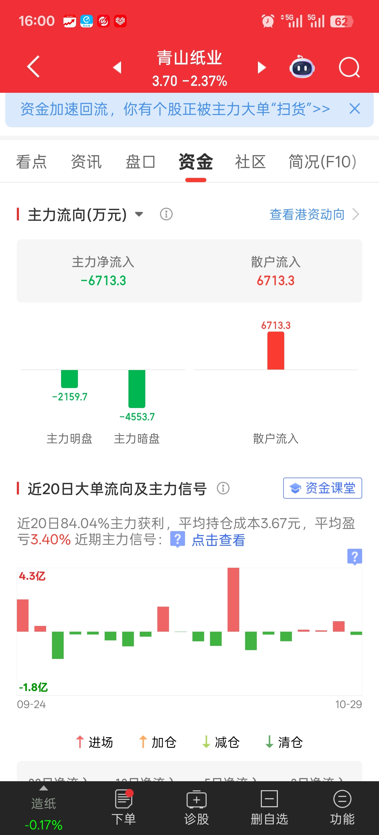 $青山纸业(SH600103)$ 主力一天跑完