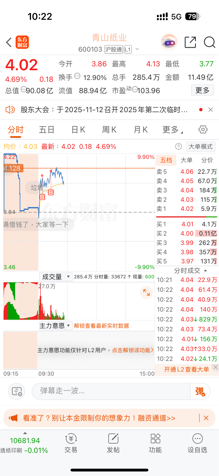 $青山纸业(SH600103)$ 不好意思,我买了,怕他涨停立马买了