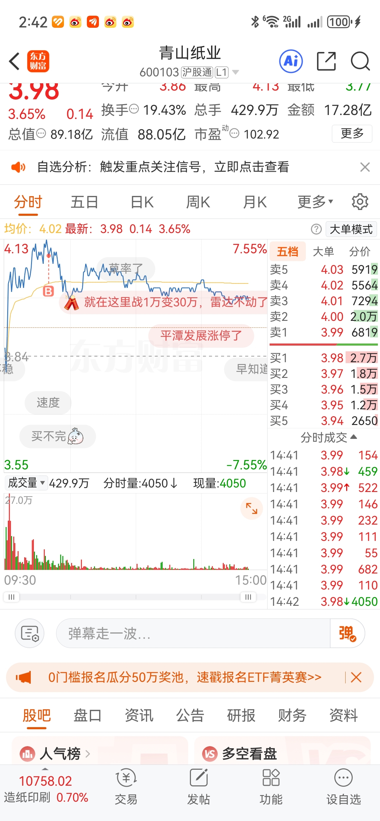 $青山纸业(SH600103)$ 高位没出 后悔加仓了。