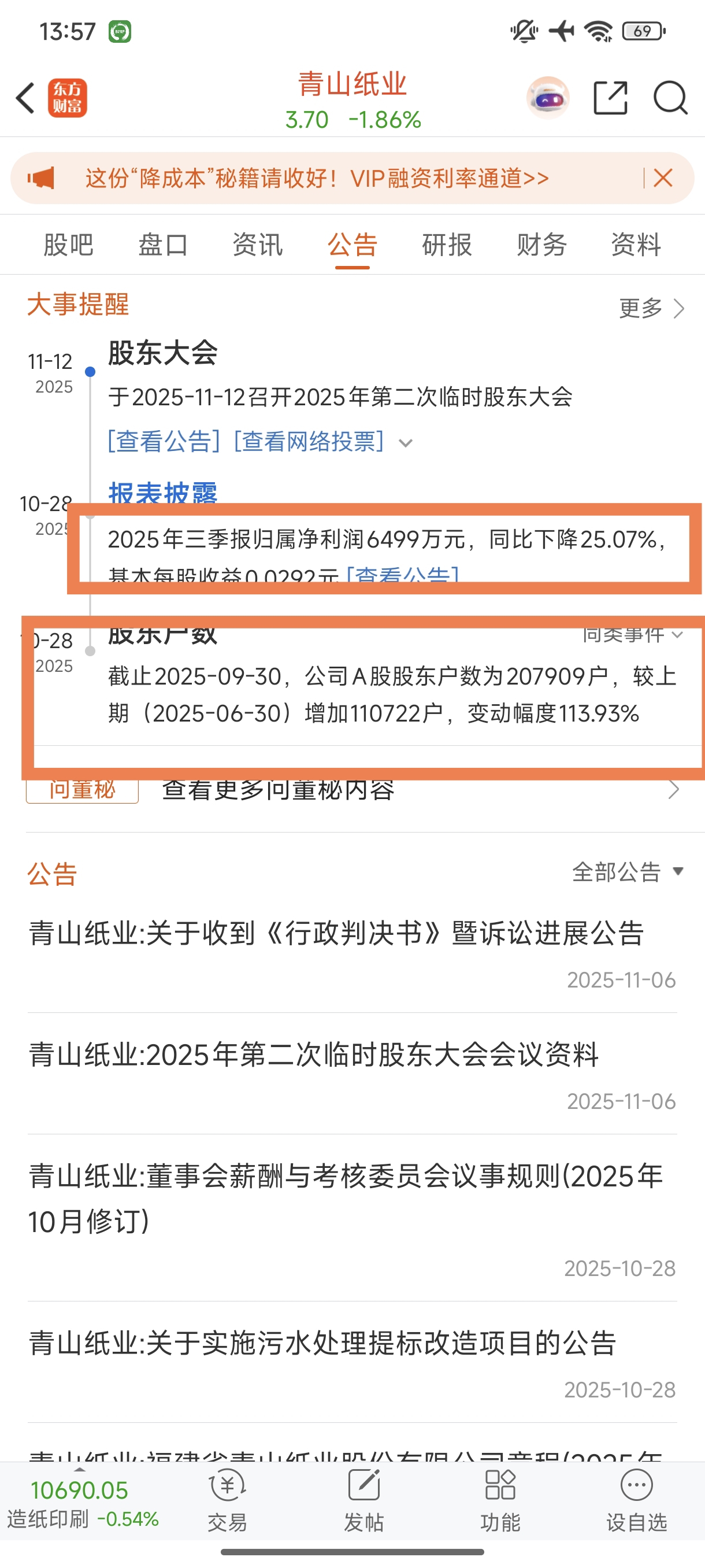 $青山纸业(SH600103)$ 散户太多业绩不及预期