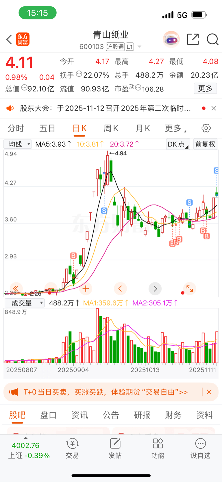 $青山纸业(SH600103)$ 尾盘出了一半,感觉没什么戏!不知对错