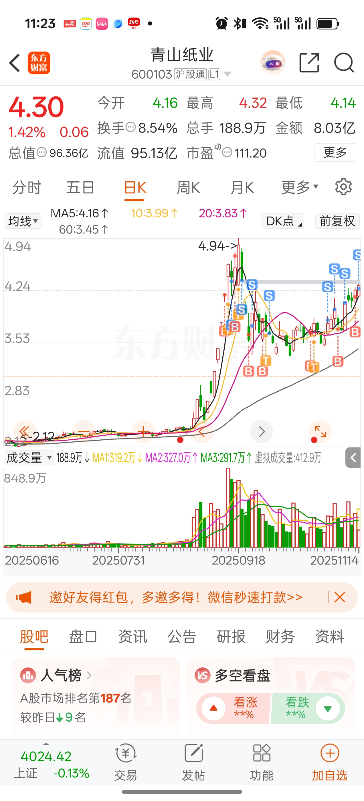 $青山纸业(SH600103)$ 还剩1000股 留着10元卖 锁仓了。