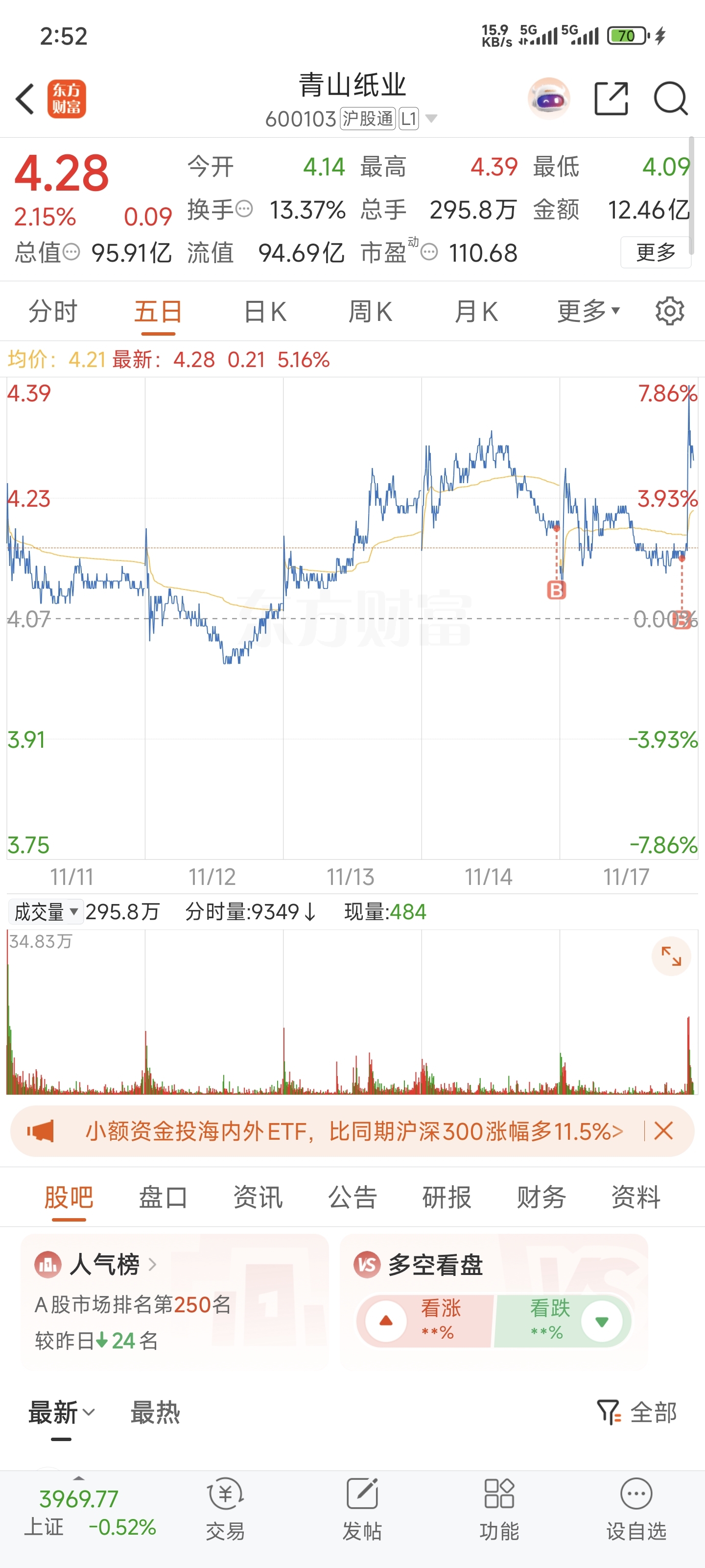 $青山纸业(SH600103)$ 你这是干鸡毛呢,尾盘拉这么猛