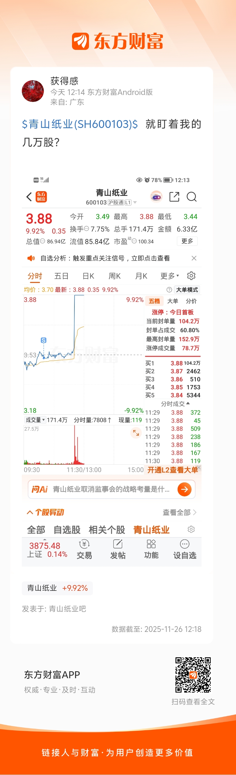 $青山纸业(SH600103)$  就盯着我的几万股?