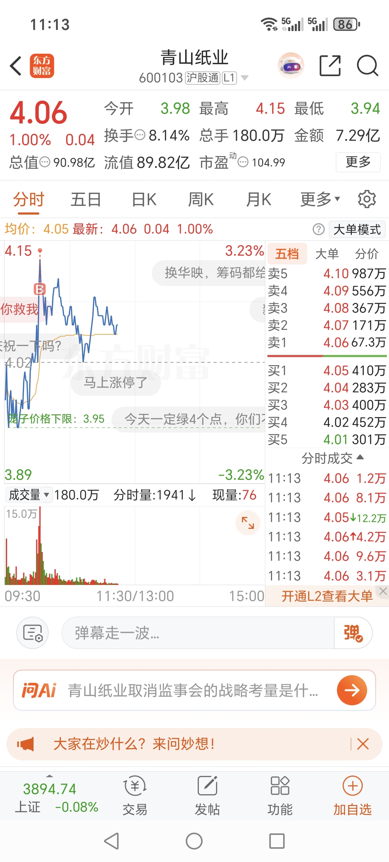 $青山纸业(SH600103)$ 做兄弟在心中,主力把我挂空中