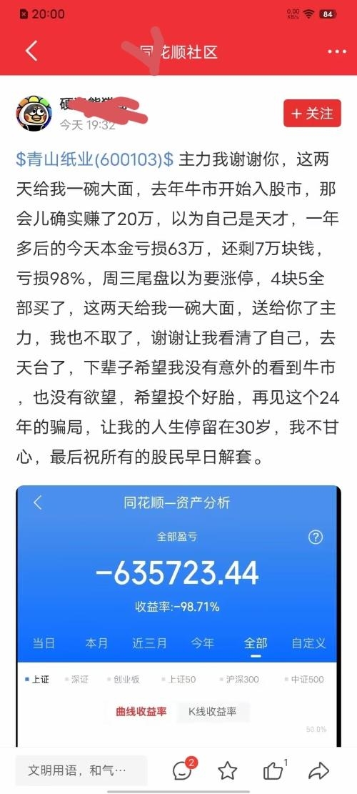 $青山纸业(SH600103)$ 股市无情,主力无情!人间有情!