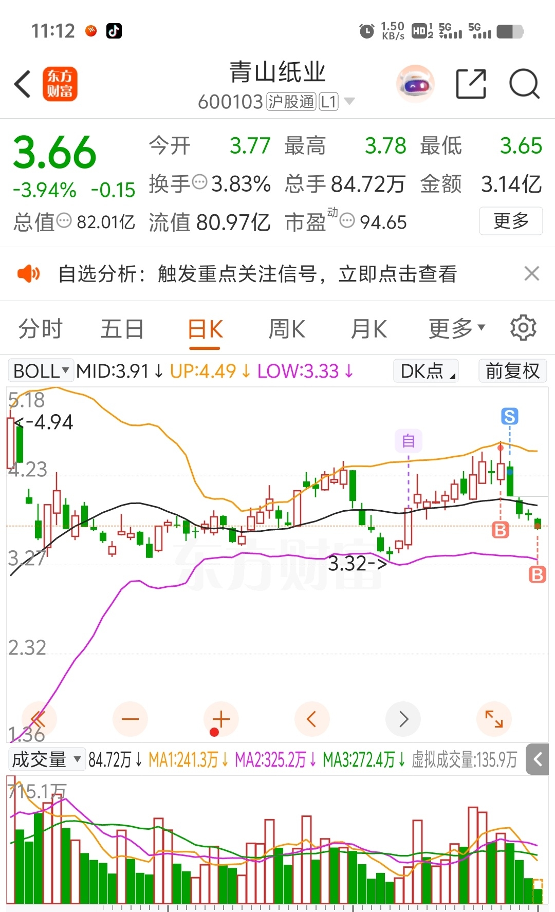 $青山纸业(SH600103)$ 朋友们我又进来了。。。。。。