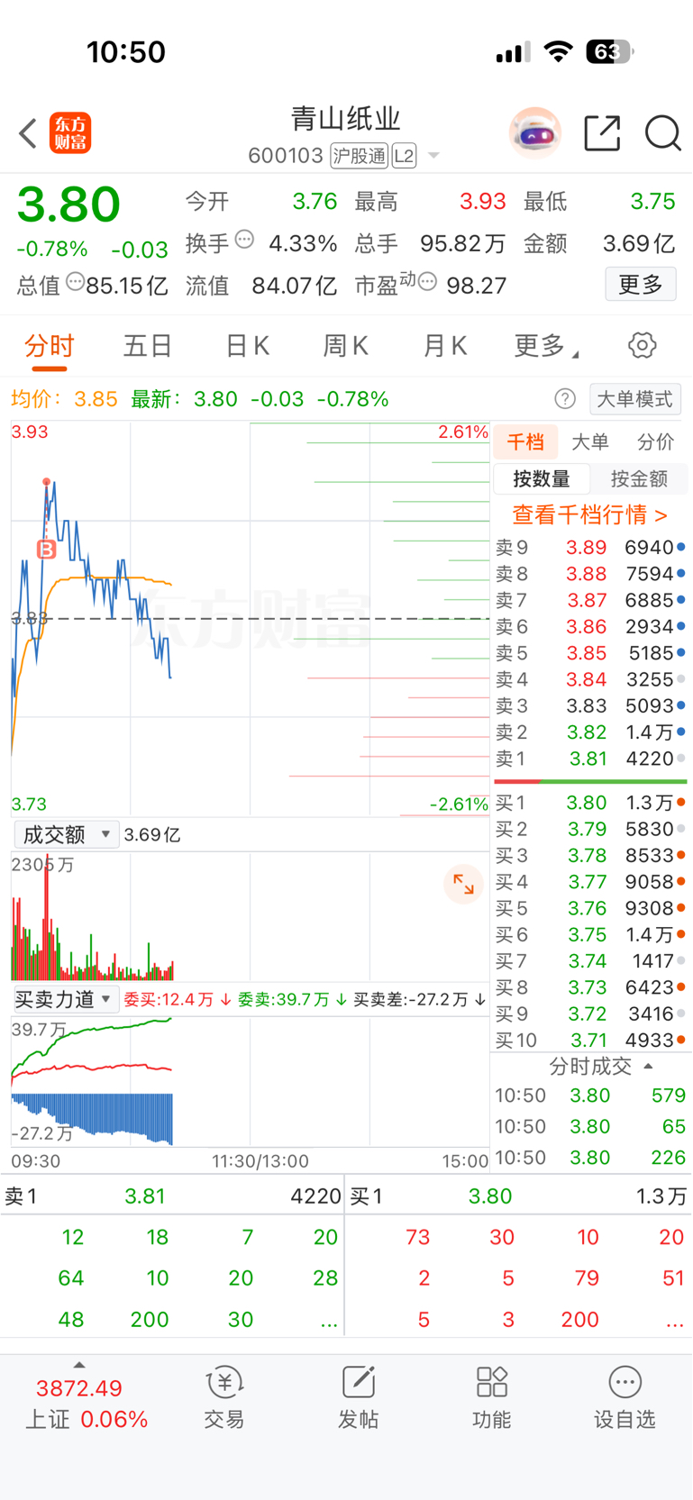 $青山纸业(SH600103)$ 兄弟们今天是我打下来的