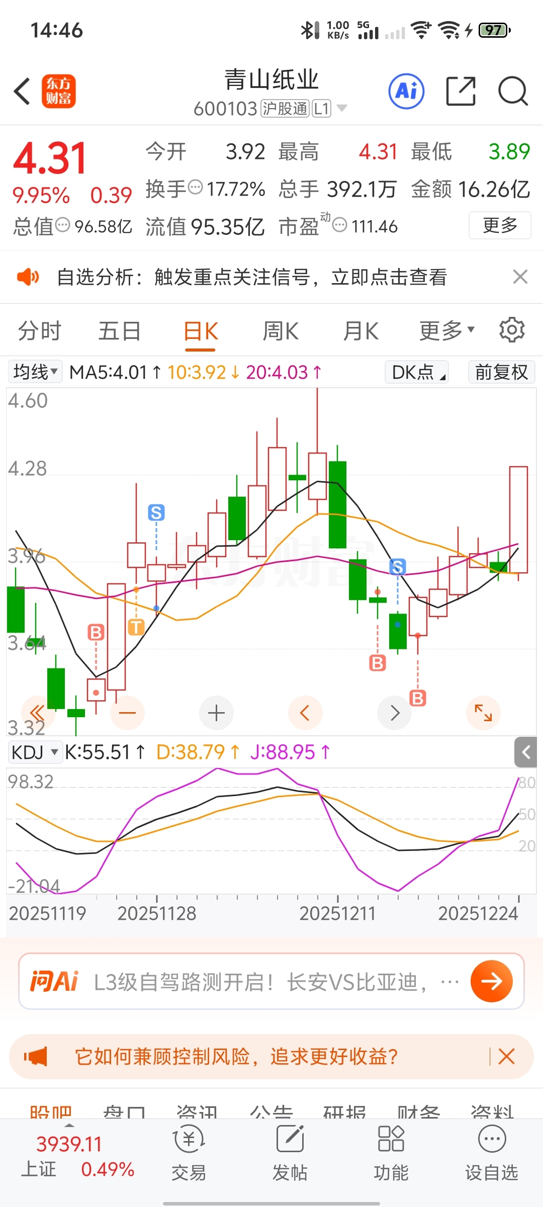 $青山纸业(SH600103)$ 还好这次拿住了