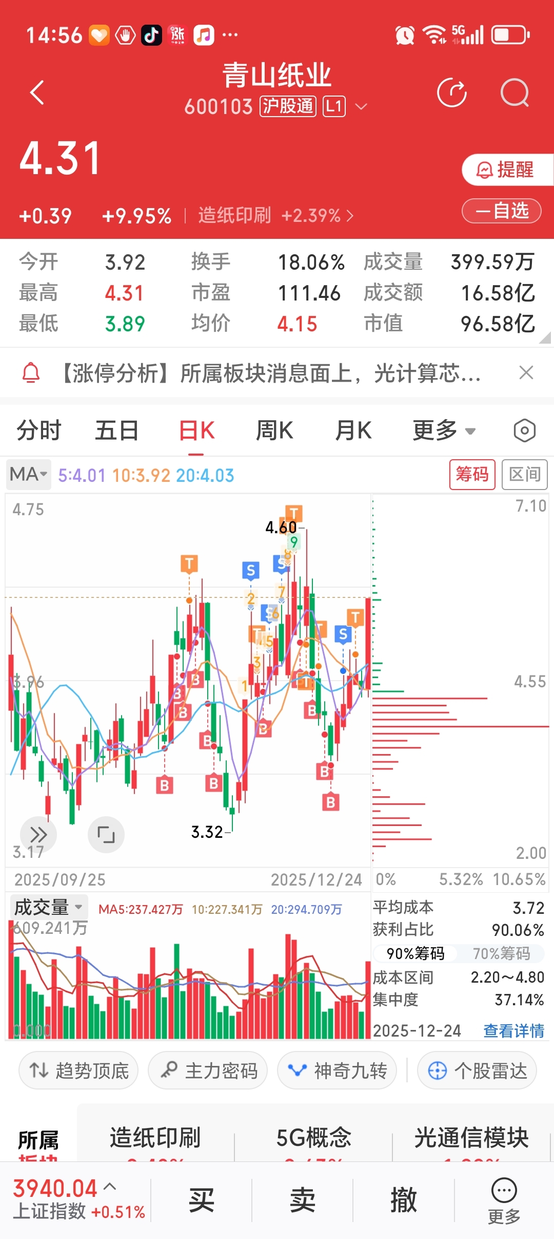 $青山纸业(SH600103)$ 今天没封我就全出来了留了个底仓看看明天接的回来不