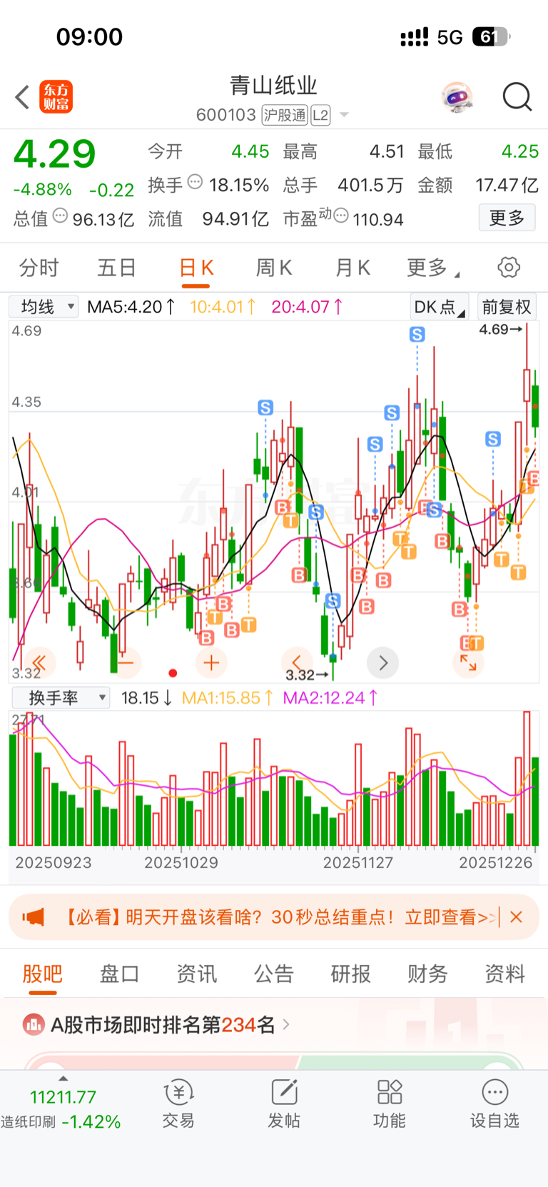 $青山纸业(SH600103)$ 看着自己这两个月的操作感觉自己好蠢,本来在上一次涨停就回本可以跑了结果受不了卖在底部只留了100股,后面看它拉高以为第2波要来了又吃进去,没想到又这样4连跌,现在终于回本还赚了11个点了真的不容易啊,下星期一情况不妙不在留念了有缘再见,祝里面的兄弟发财吧