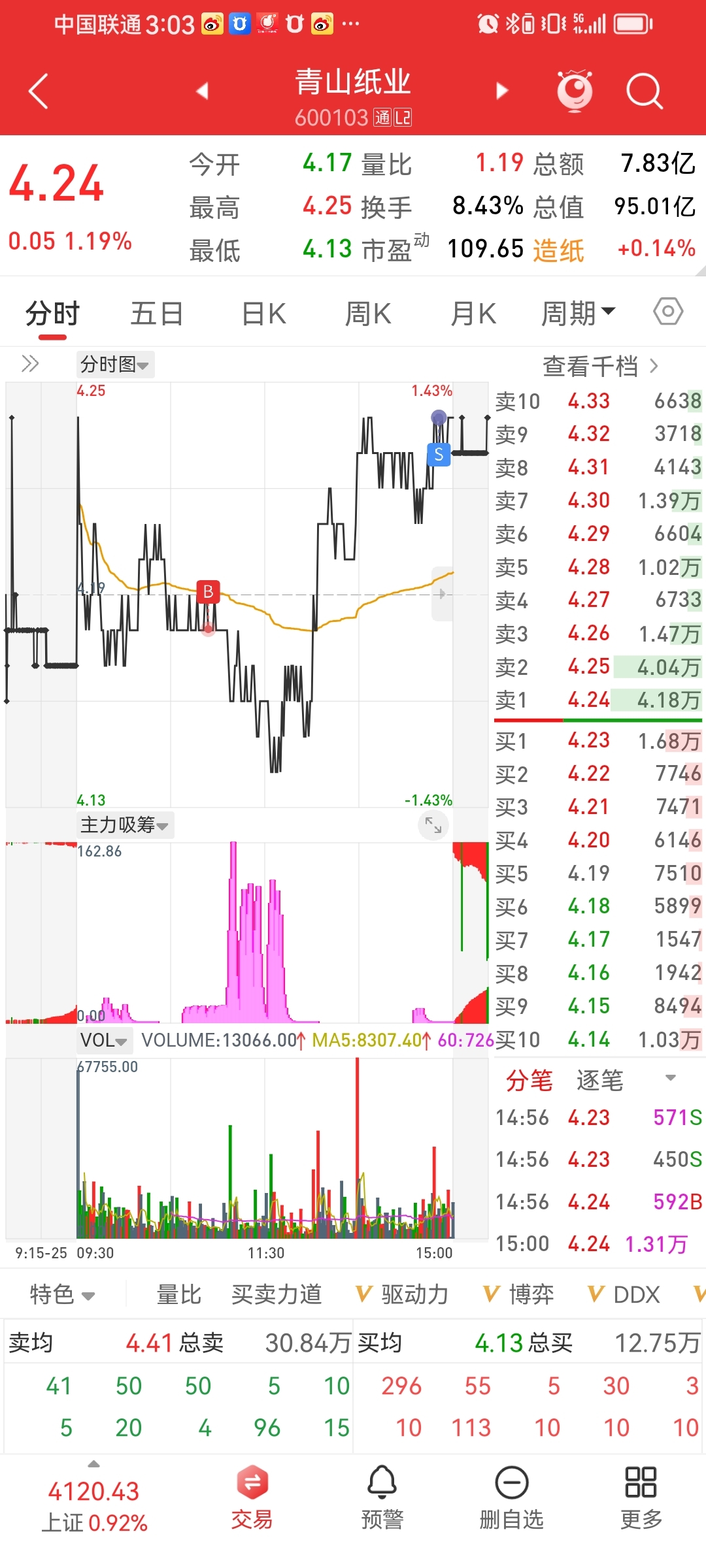 $青山纸业(SH600103)$ 昨天尾盘t出去了,一分钱不挣,进了别的打野,今天搞到五个点,上午又买进来,下午挣一个多点,又t出去,又进了别的打野,反正织布机,都干耗着吧,不到目标价我就不走,今天还是做t的钱还是多少弄到六个多点