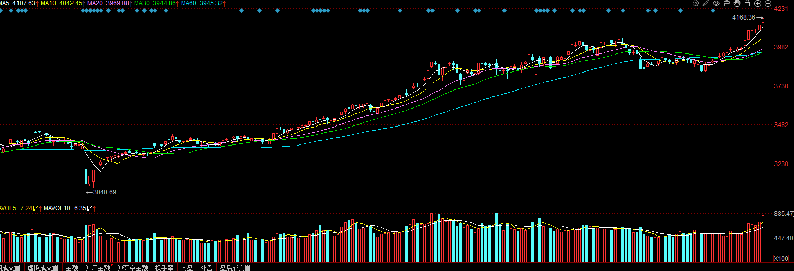 周一市场收涨,指数、个股、情绪继续共振向上,量能放大到了3.6万亿,商业航天继续强势,AI应用预期内加强,这两大板块作为后续的主阵地,还会反复很久,而核聚变、机器人、脑机接口、消费等穿插轮动,整体呈现一超一强多热的格局。从周期节奏来看,短期AI应用的弹性可能更大点。而如果后续商业航天回调,则依然是踩节奏的机会。