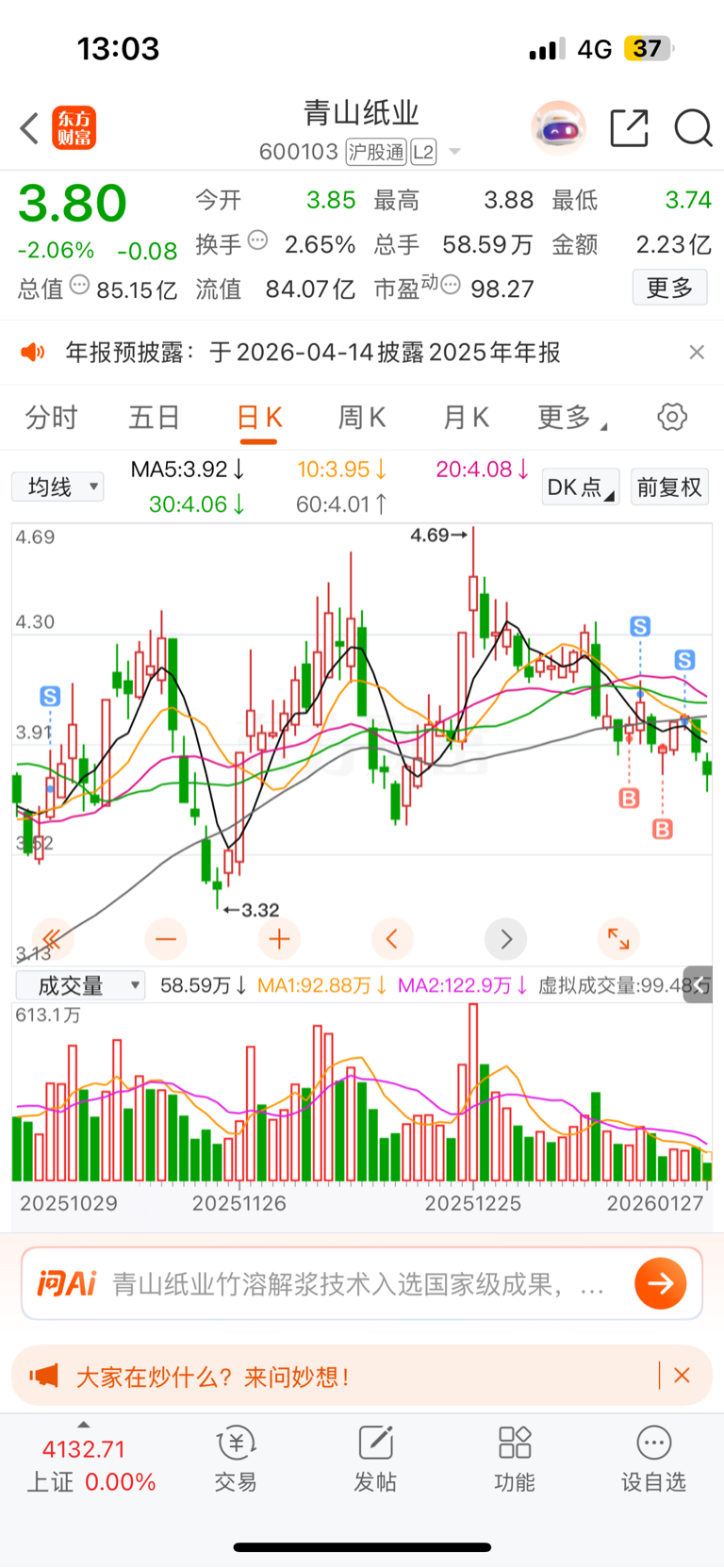 $青山纸业(SH600103)$ 再等等,我要回来了