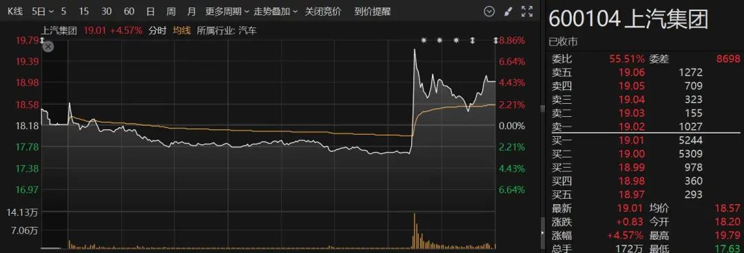 受此消息刺激,2月11日,上汽集团股价午后直线拉升大涨,最高涨近8%,截至收盘,仍上涨4.57%至19.01元/股。