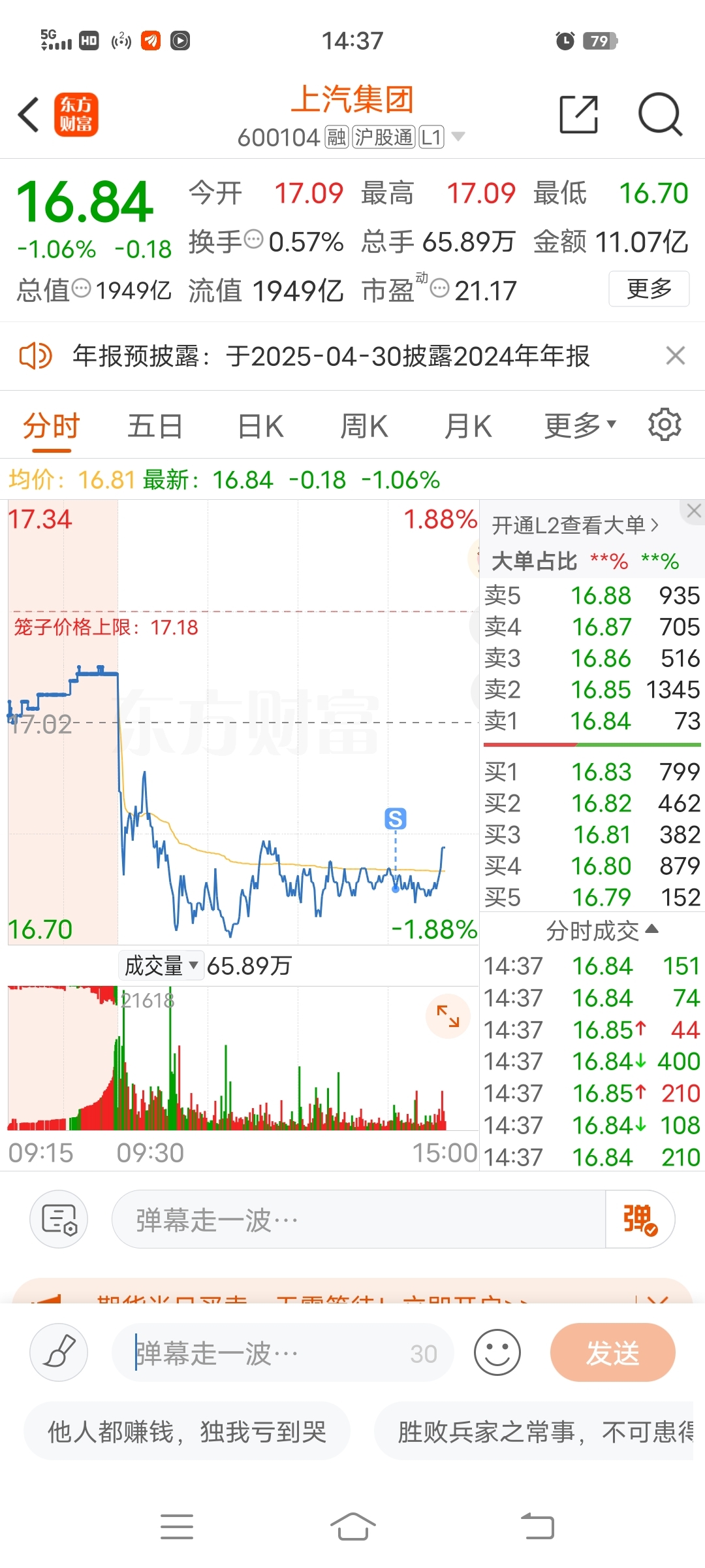 $上汽集团(SH600104)$ 半个月亏了十个点。算了祝您们涨停