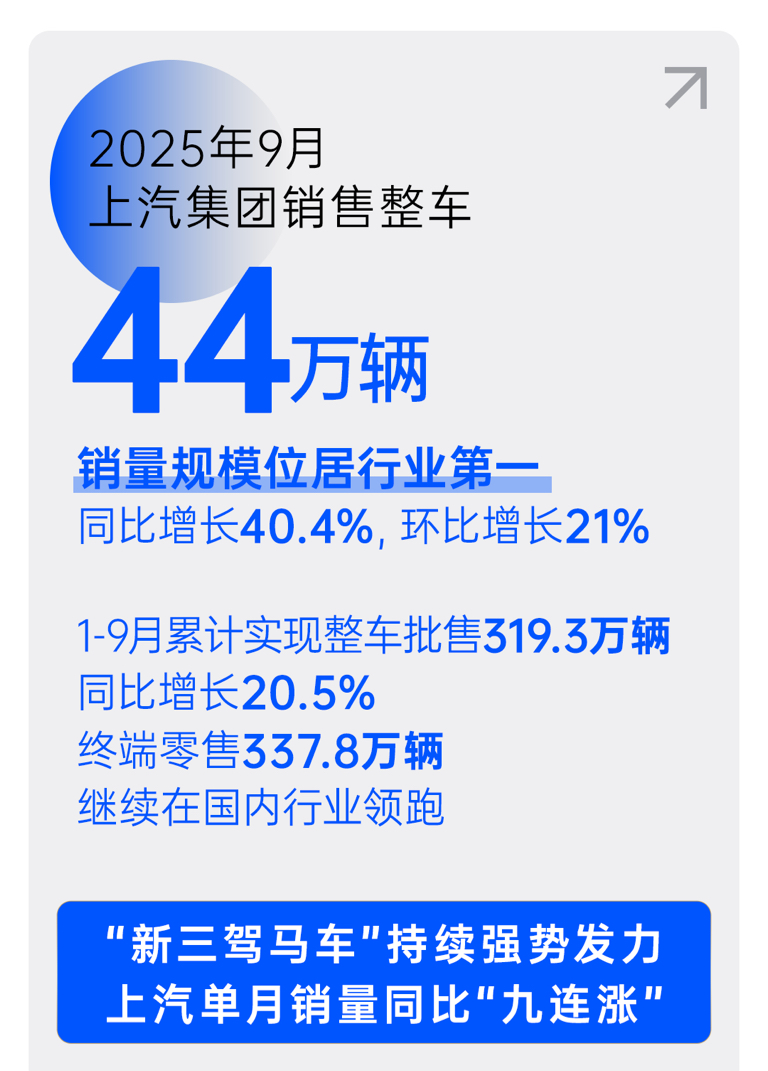 上汽集团9月份销售44万辆行业第一同比猛增四成