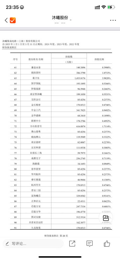 上汽集团(中金上汽)间接持有沐曦集成电路公司股份0.9492%股份,各位中小股东