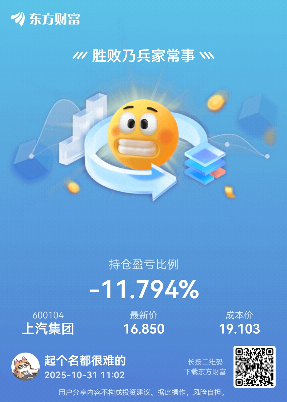 $上汽集团(SH600104)$ 每天瞄一眼,今天涨半个点我就满足了