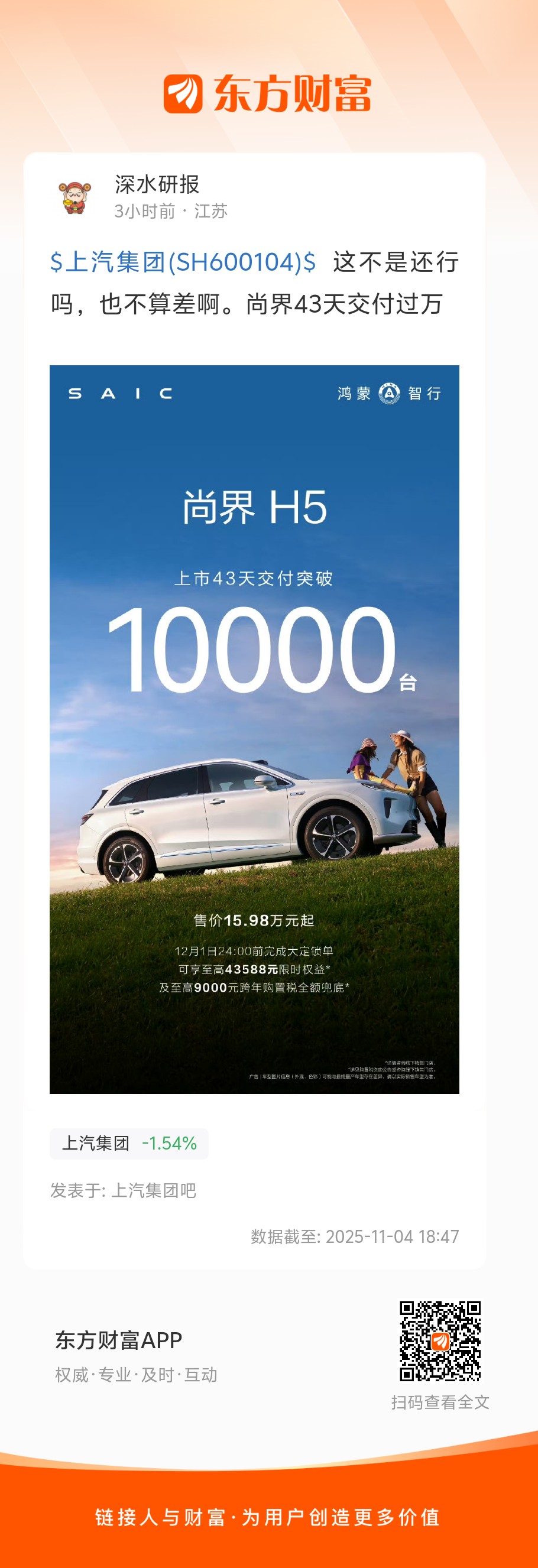$上汽集团(SH600104)$  这不是还行吗,也不算差啊。尚界43天交付过万