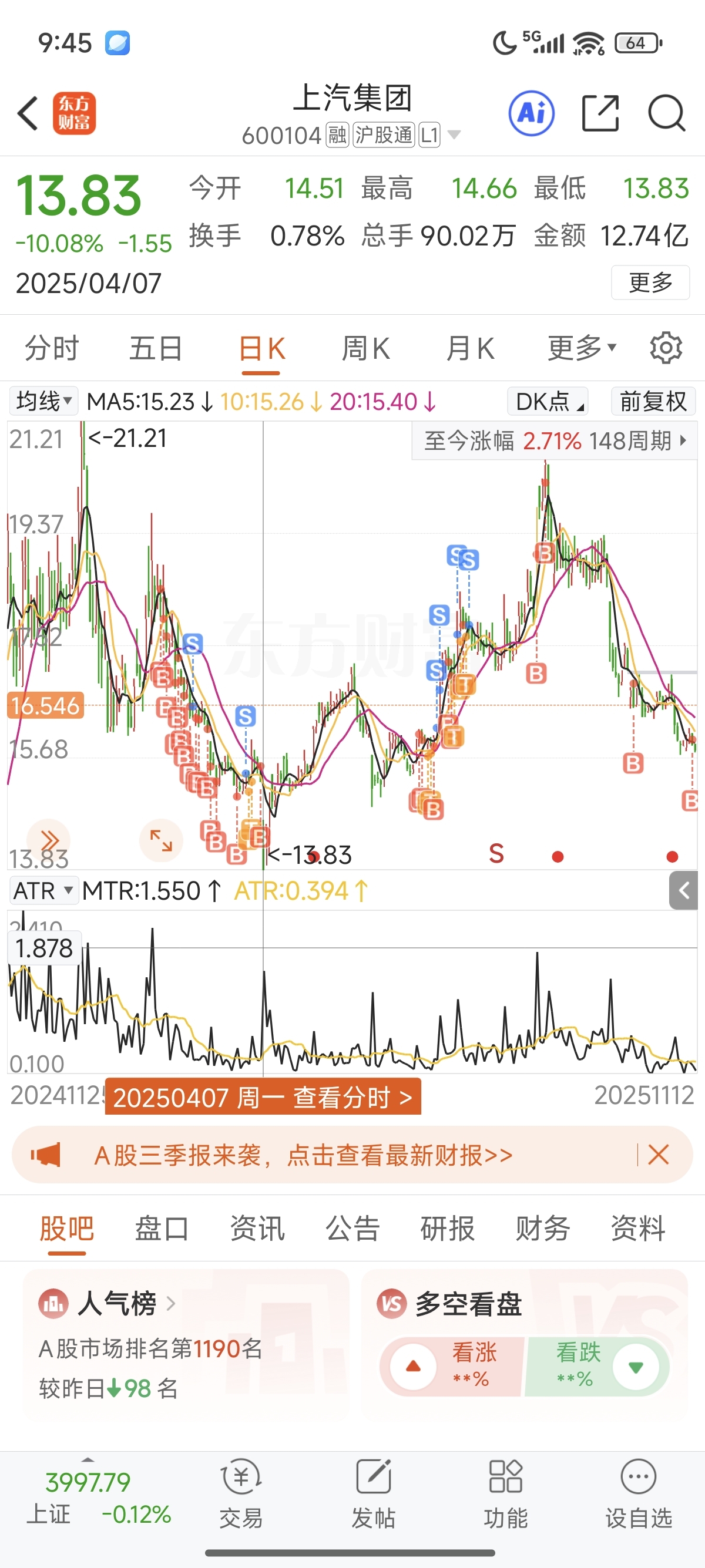 $上汽集团(SH600104)$ 老韭菜已经进场,再跌就到13块再加了。