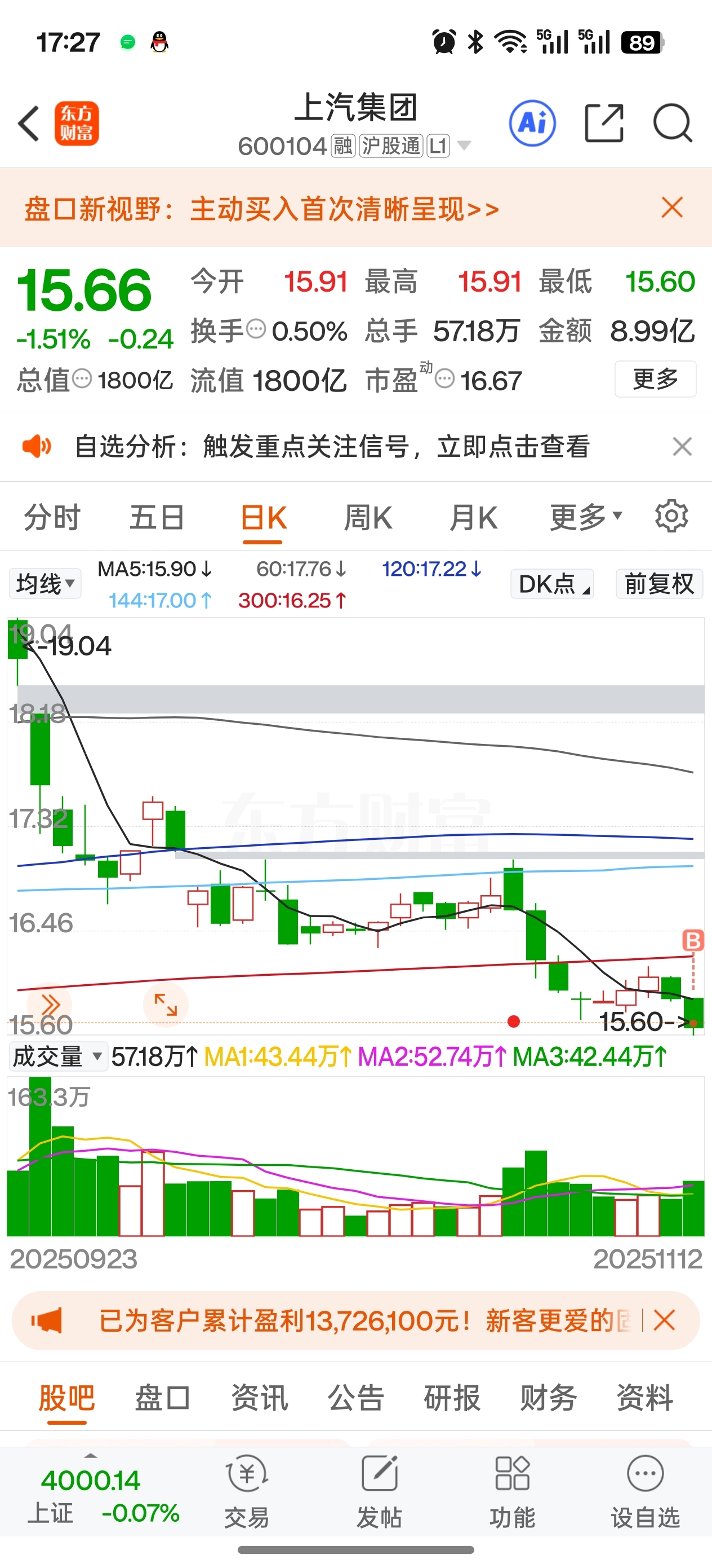 $上汽集团(SH600104)$ 希望主力明天别杀我