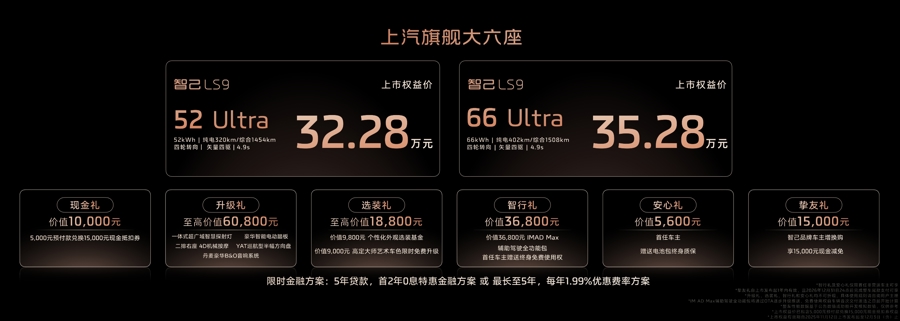 智己LS9分两个版本,52 Ultra上市权益价为32.28万元,66 Ultra上市权益价为35.28万元。