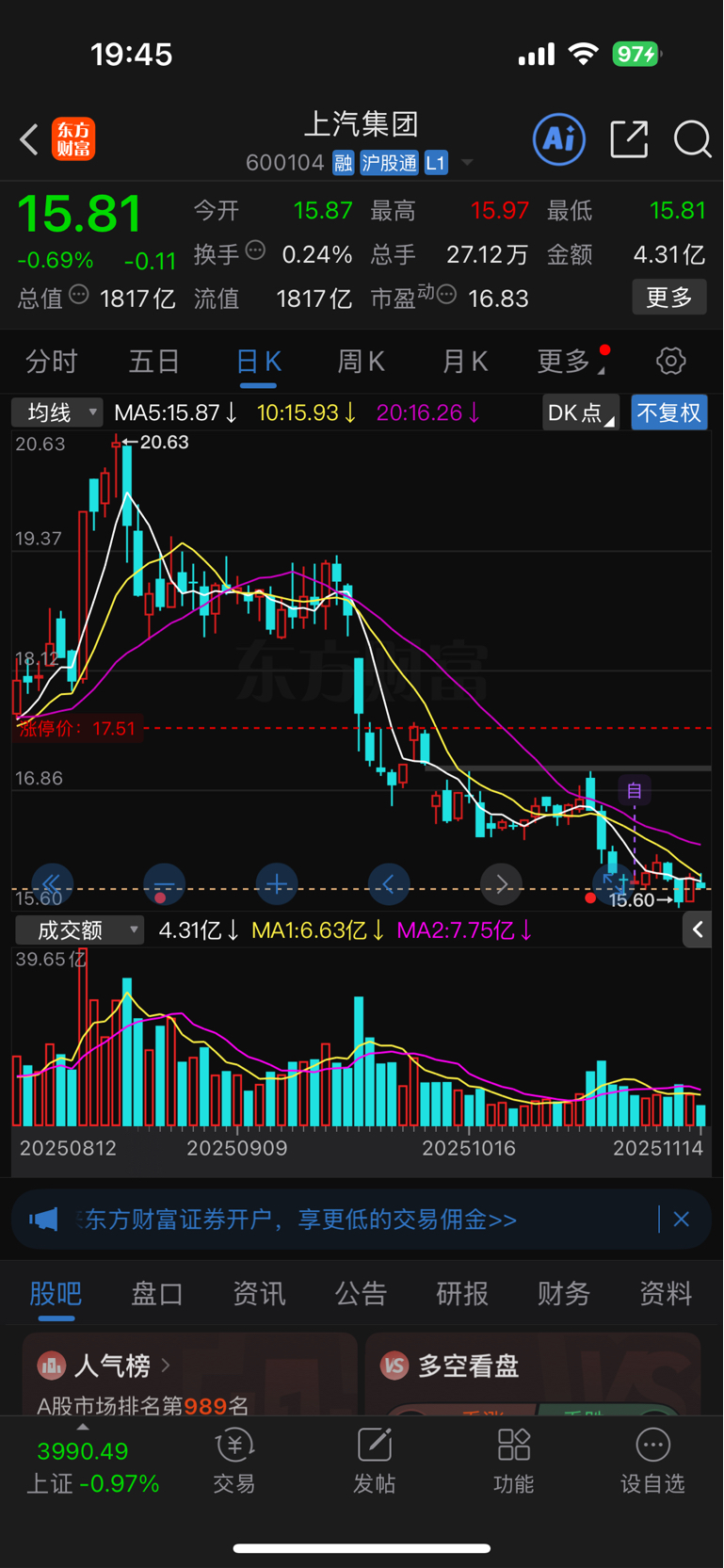 $上汽集团(SH600104)$ 踩多大的雷了一路头也不回的阴跌?公司岀来说句话,三季报造假了吗?