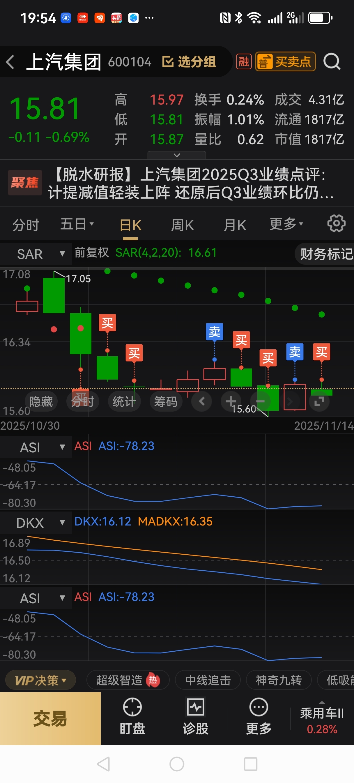 上汽集团,下周一,加仓已挂,成本15.8862。