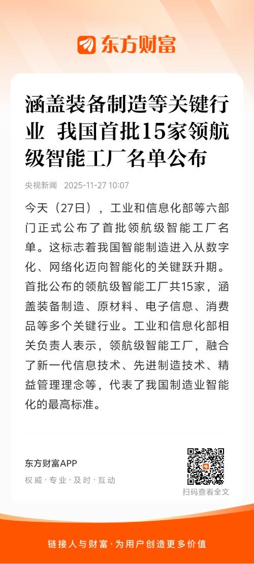$上汽集团(SH600104)$今天(27日),工业和信息化部等六部门正式公布了首批领航级智能工厂名单。这标志着我国智能制造进入从数字化、网络化迈向智能化的关键跃升期。首批公布的领航级智能工厂共15家,涵盖装备制造、原材料、电子信息、消费品等多个关键行业。工业和信息化部相关负责人表示,领航级智能工厂,融合了新一代信息技术、先进制造技术、精益管理理念等,代表了我国制造业智能化的最高标准。