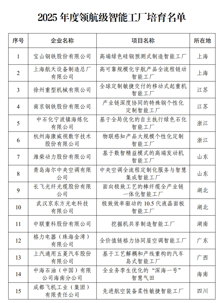 $上汽集团(SH600104)$ 今天(27日),工业和信息化部等六部门正式公布了首批领航级智能工厂名单。这标志着我国智能制造进入从数字化、网络化迈向智能化的关键跃升期。首批公布的领航级智能工厂共15家,涵盖装备制造、原材料、电子信息、消费品等多个关键行业。工业和信息化部相关负责人表示,领航级智能工厂,融合了新一代信息技术、先进制造技术、精益管理理念等,代表了我国制造业智能化的最高标准。