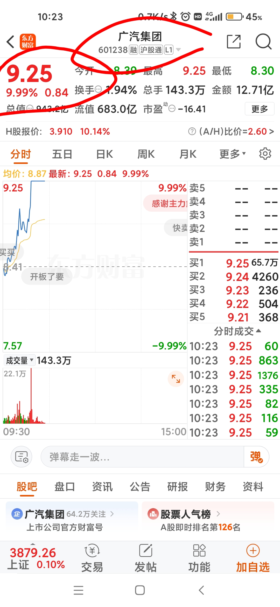 广汽广汽!够威够气!上汽上汽,垂头丧气!广汽涨停了!