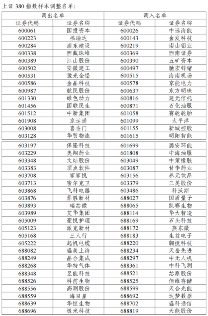 上证380指数样本股调入中远海能、金发科技、南山铝业、西南证券、五矿资本、驰宏锌锗、海南机场、京能电力、东方明珠、建元信托、石化油服等38只个股,调出国投资本、福瑞达、浦东建设、西藏珠峰、江山股份、安徽建工、豫光金铅、金晶科技、航民股份和绿色动力等38只个股。