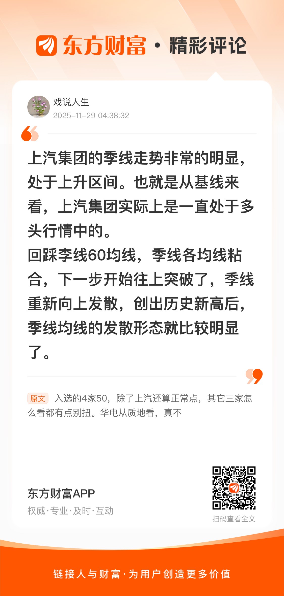入选的4家50,除了上汽还算正常点,其它三家怎么看都有点别扭。 华电从质地看,真不怎么样,电力股低价优质的不少,不知为何它中枪!北方稀土,中科曙光,呵呵了,牛市后期,九菜䏕,再给个新高溢价吧, 这样的股适合有钱人玩,赔了就当娱乐消遣了,反正买个豪车也是花着玩。普通人血汗钱,攒起来的。这样的要远离。基本面都透支了,质地也不怎么样,题材股,这个位置不具备投资价值了,全看这波牛市能持续多长时间。只有真正的价值驱动型,也就是业绩驱动型的优质股,才具备长期投资价值和避险抱团价值。上汽从2016年到2018年,在同期指数大跌,大多数个股惨不忍睹的时候。是一路逆势上涨的。是避险性白马股。 基本上和白酒同期见顶,月线补跌一一主要是行情转暖,白马股失去了变现价值,板块开始轮动,大批量资金从白马股身上撤退,流向其他被砸出坑的中小等超跌低价股。 一直调整到2024年1月份左右。现在的上汽集团就处在这轮调整的末期。现在的股价,正好处于月线大区间震荡下轨处一一所以说只有上汽集团的入选才正常点,把他比喻个人,他才算是个正常人。
