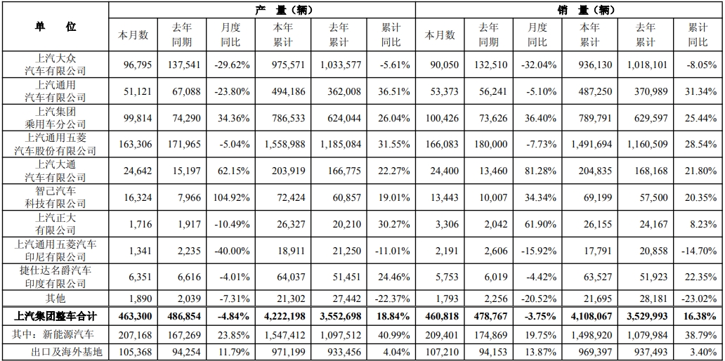 $上汽集团(SH600104)$ 2025年11月份的产销双降
