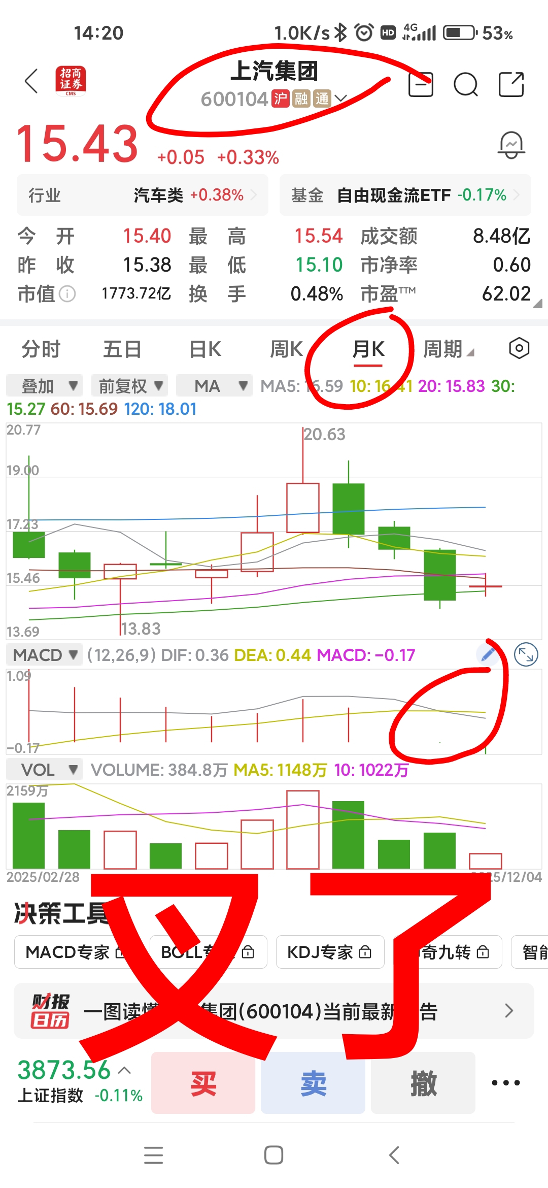 $上汽集团(SH600104)$ 上汽月线死叉成立!可以放心的跌了!在2026年上半年!有的也是反弹!