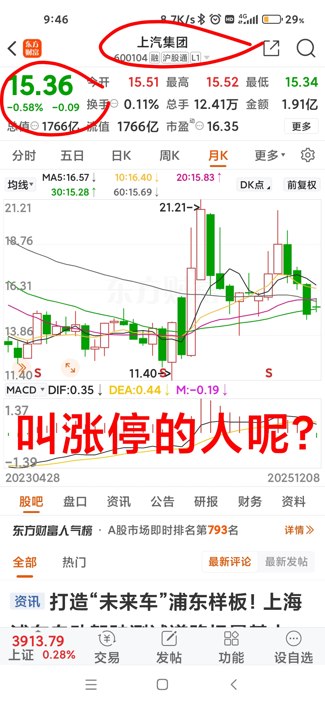 $上汽集团(SH600104)$ 叫涨停的人去哪了!尽是忽悠之能!骗小散接盘入套!
