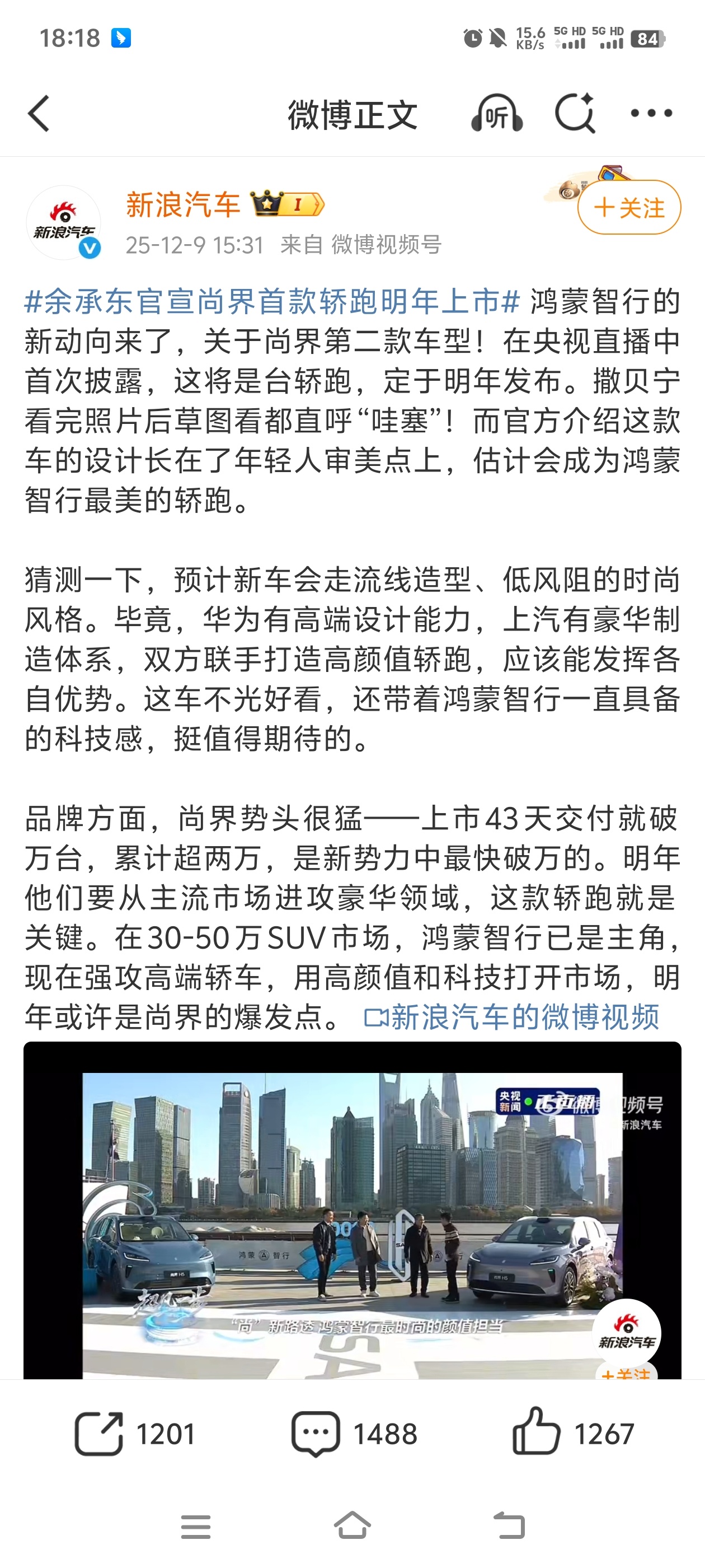 华为常务董事、产品投资委员会主任、终端BG董事长余承东表示,新车预计明年春天见。