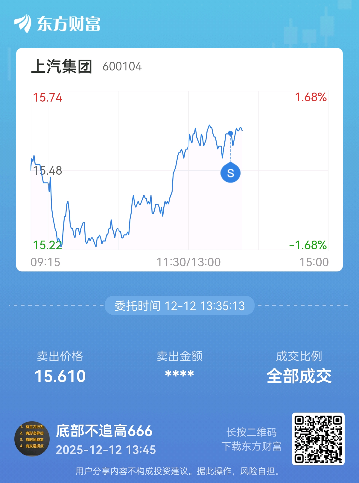委托标的:上汽集团600104买卖方向:卖出笔记:15.61