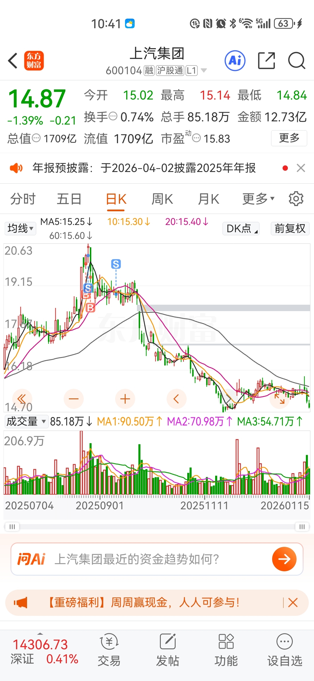 最恶心的股票,还好亏几个点跑了,要不气死,不过跑了之后去了万达,真是难兄难弟,比上汽还恶心。唯一好处就是不会亏,也不会涨,今天也卖了万达,t个半死赚6个点,还好不是重仓他,我就是看见他利润360亿,股价28,260亿股价20.现在110亿不要到10块去才割肉。等他利润到360亿估计我挂了都难实现。基金给他目标10几年都是10-15倍市盈率,一坨