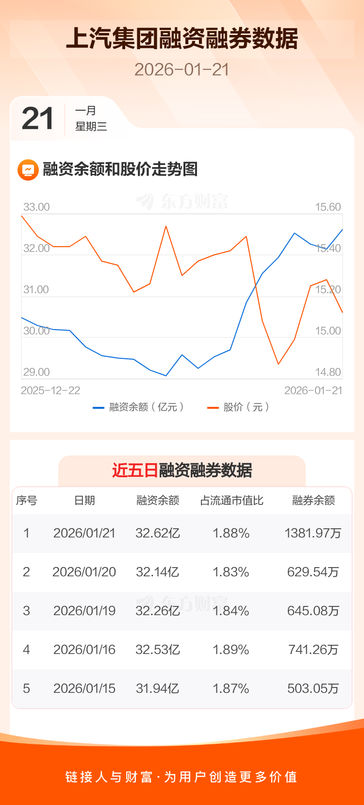 交易所最新数据显示,上汽集团于2026年1月21日获融资买入1.24亿元,融资偿还7567.94万元,当日融资净买入4869.45万元。目前,该股融资余额32.62亿,占流通市值比例为1.88%。