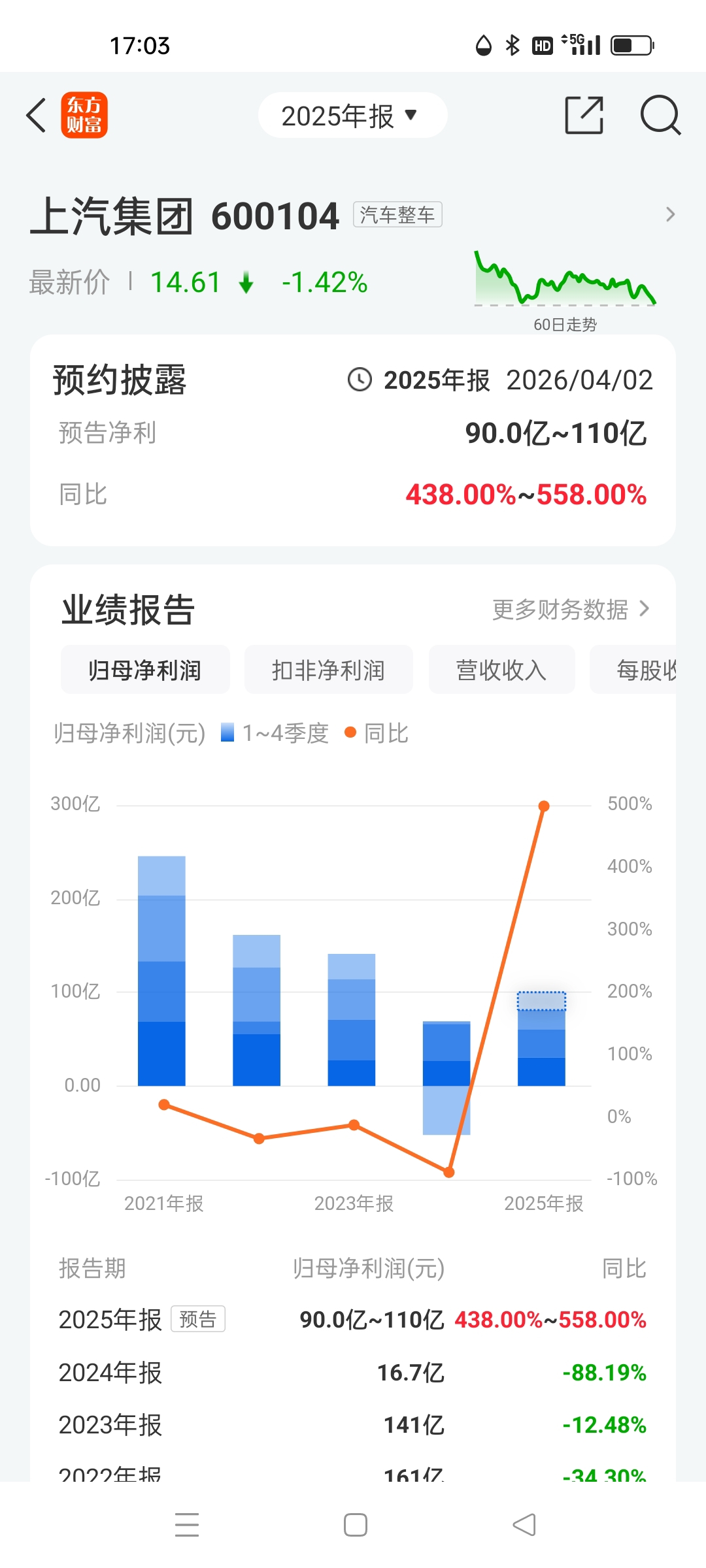 $上汽集团(SH600104)$ 净利同比大涨500%