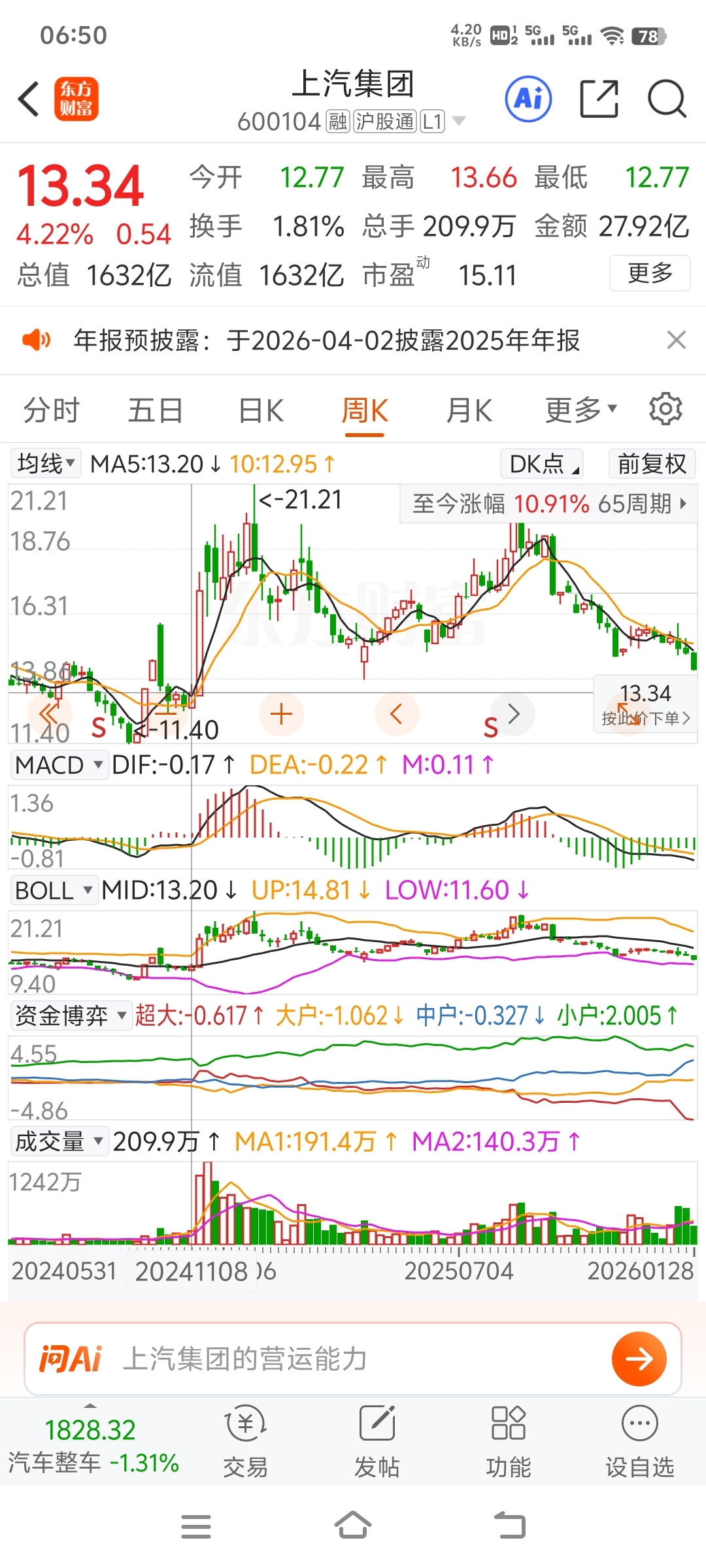 $上汽集团(SH600104)$ 很有可能跌的13.34周线起涨位置。