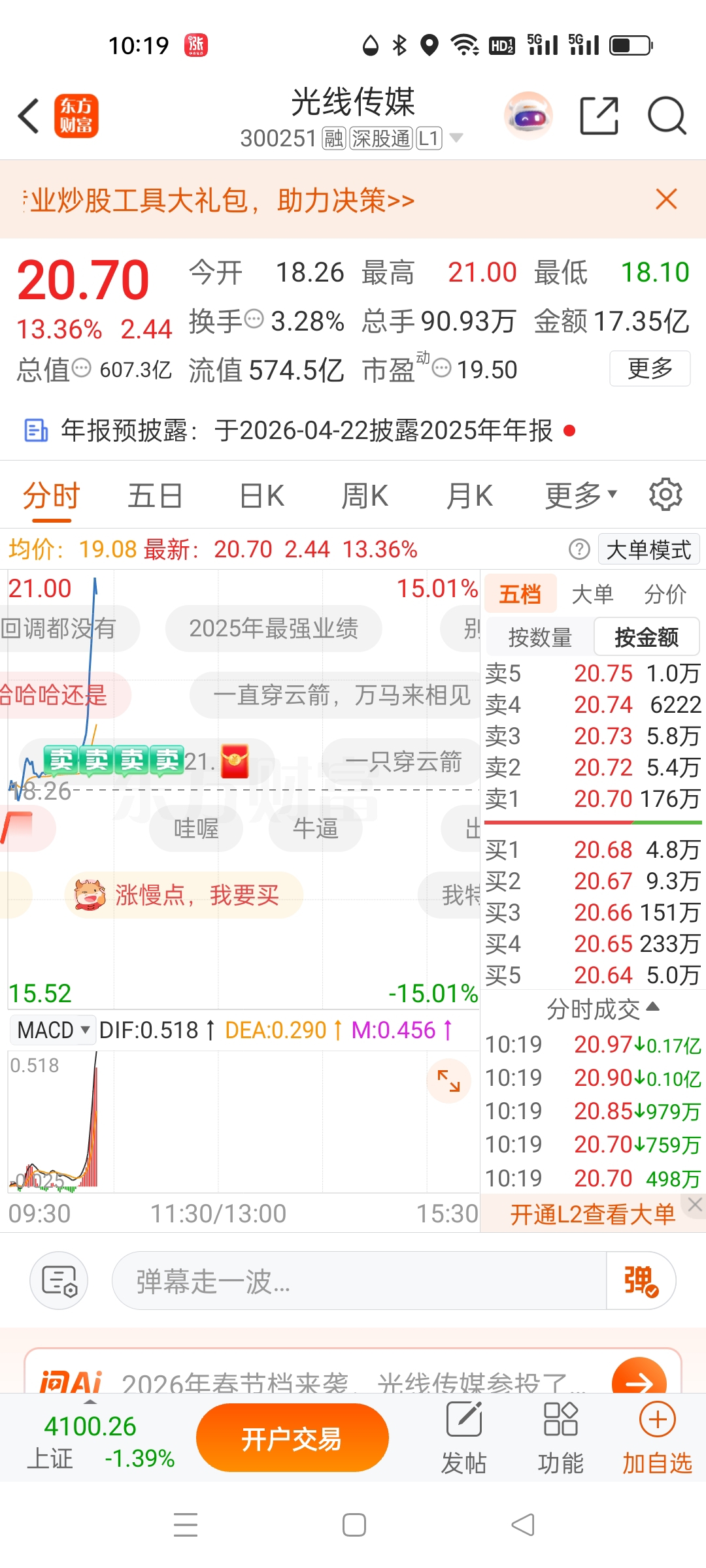 光线一样预增500%左右,高位拉上来近16%,上汽快新低,下午拉上来1.5%应该