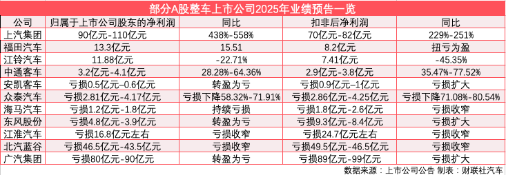 财联社1月30日讯(记者徐昊)截至1月30日,11家A股上市整车企业陆续披露2025年业绩预告,整体业绩呈向好态势。其中,四家车企成功实现盈利,另有三家车企实现亏损收窄,超六成企业经营状况得到改善。