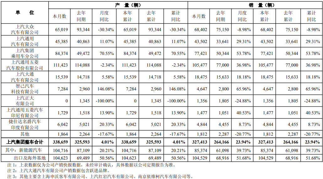 上汽集团1月销量同比增23.94% 海外业务涨幅超50%