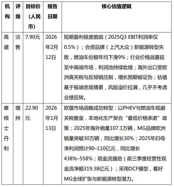 高盛和摩根士丹利对上汽集团的估值